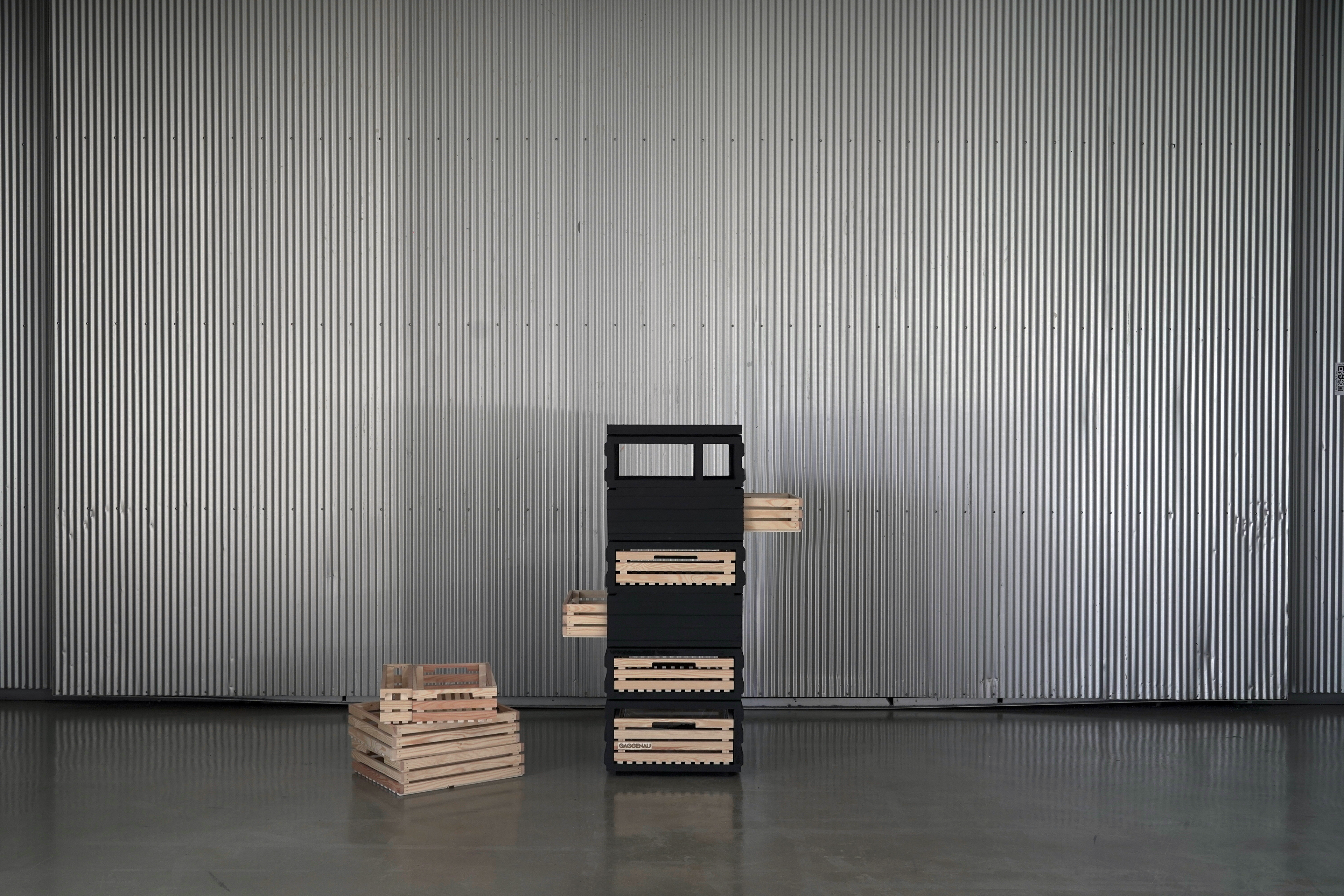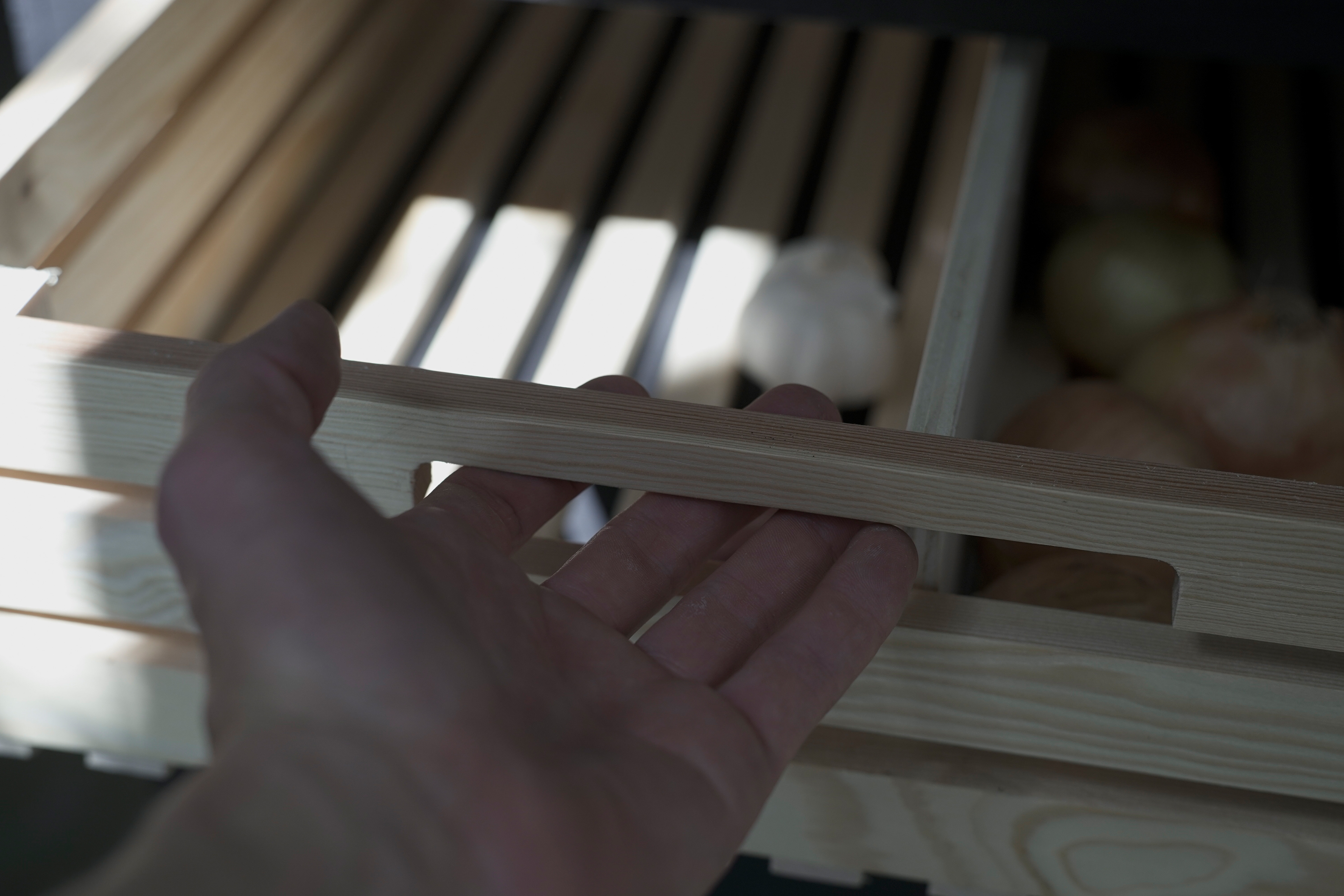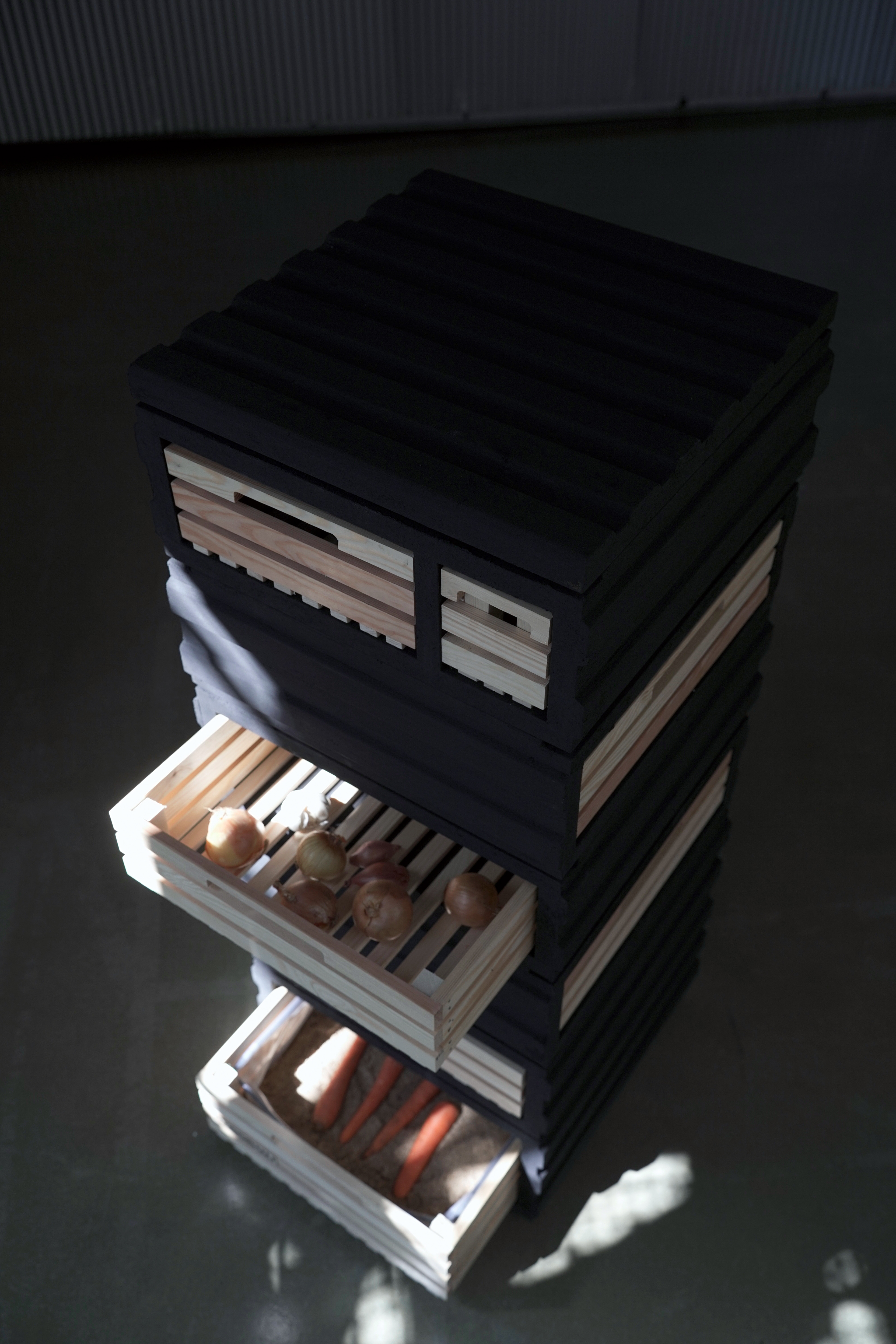 Die Module werden Stranggepresst und können sowohl gleichseitig, als auch um 90° verdreht aufeinander gestapelt werden, um so ein von allen Seiten erreichbares Lager zu schaffen. Die Lebensmittel selbst sind in hochwertigen Steigen aus Hartholz gelagert, die stapelbar sind und sich leicht ganz entfernen lassen. So können sie auch direkt zur Ernte oder zum Markt mitgenommen werden, um den Einkauf zu transportieren.