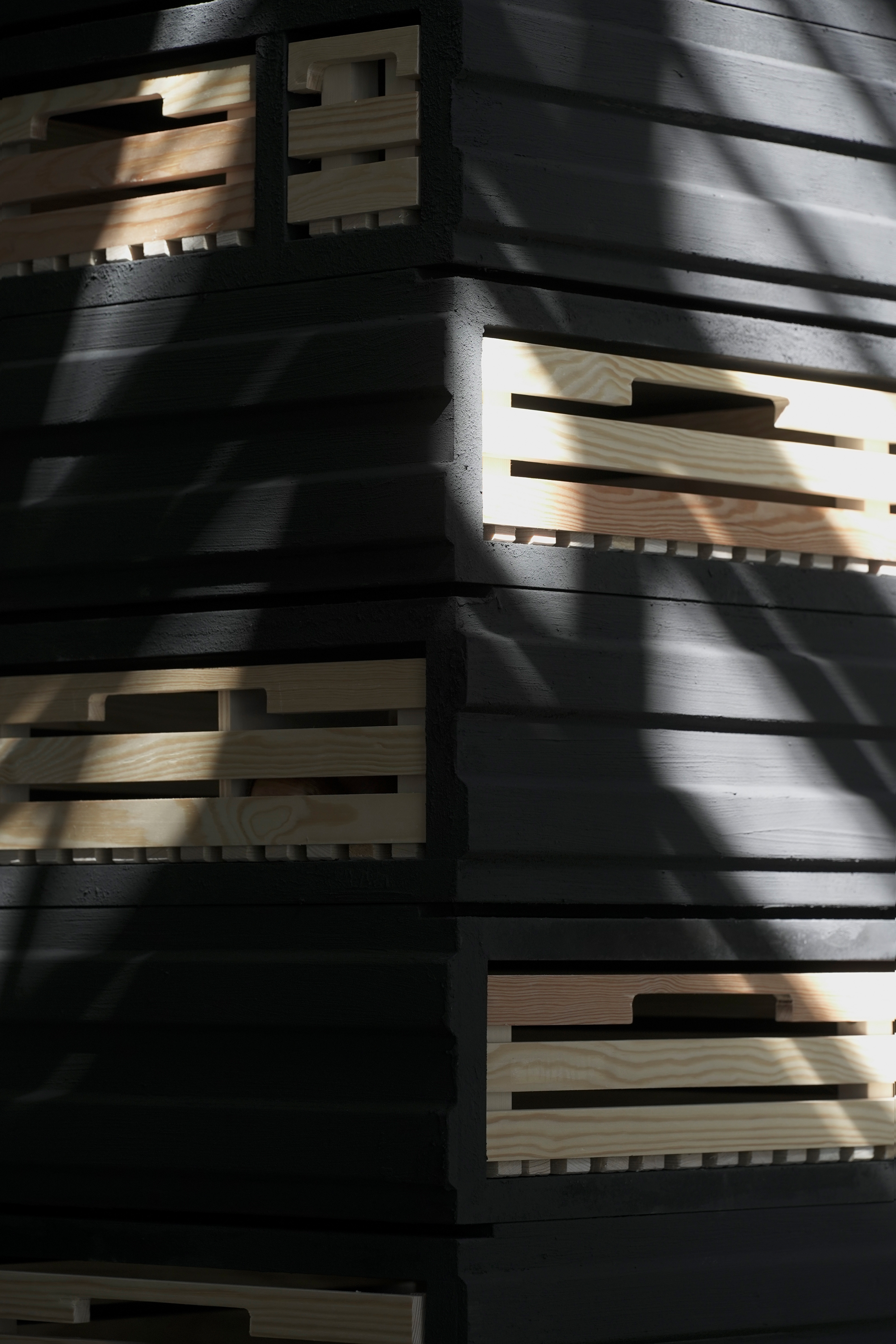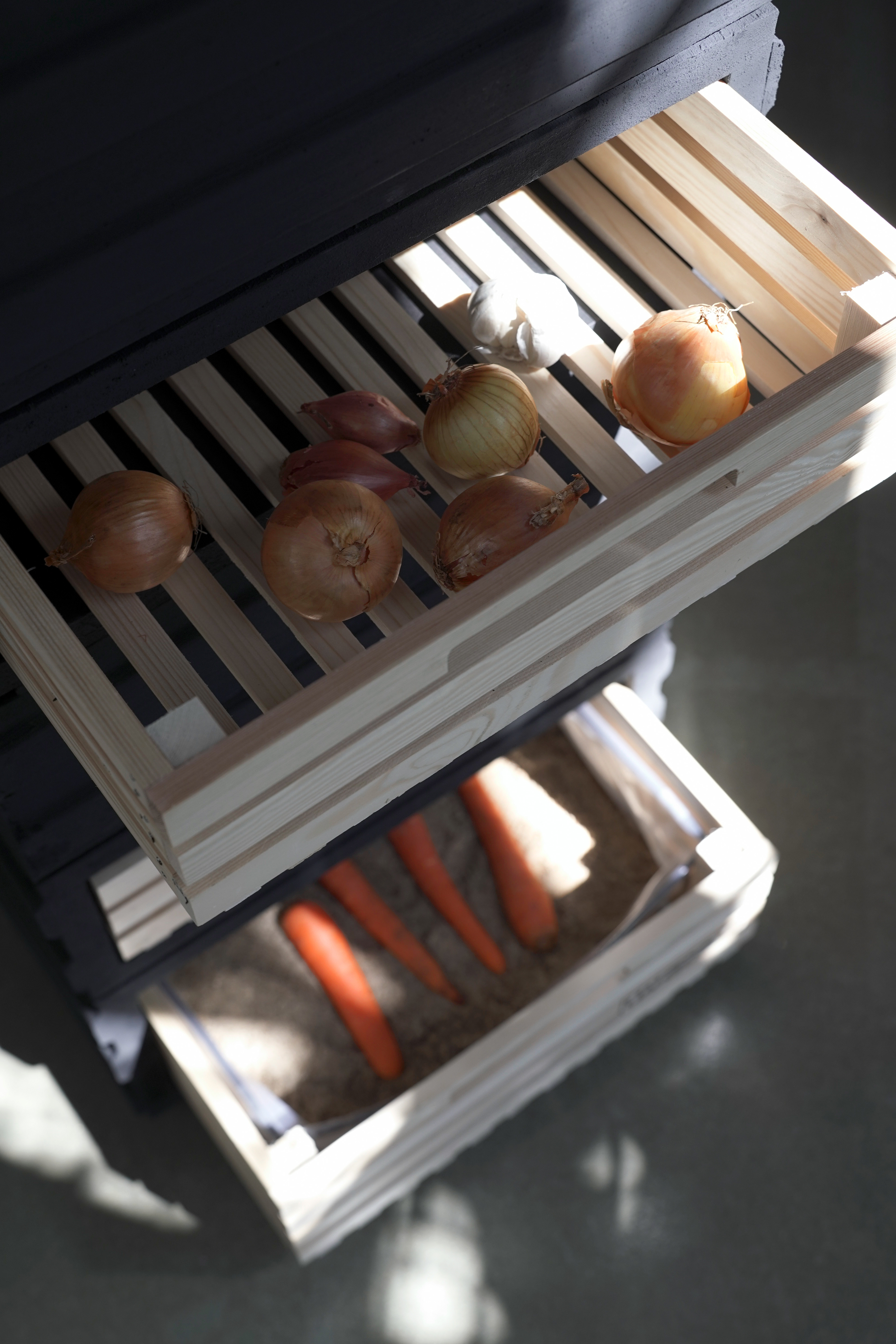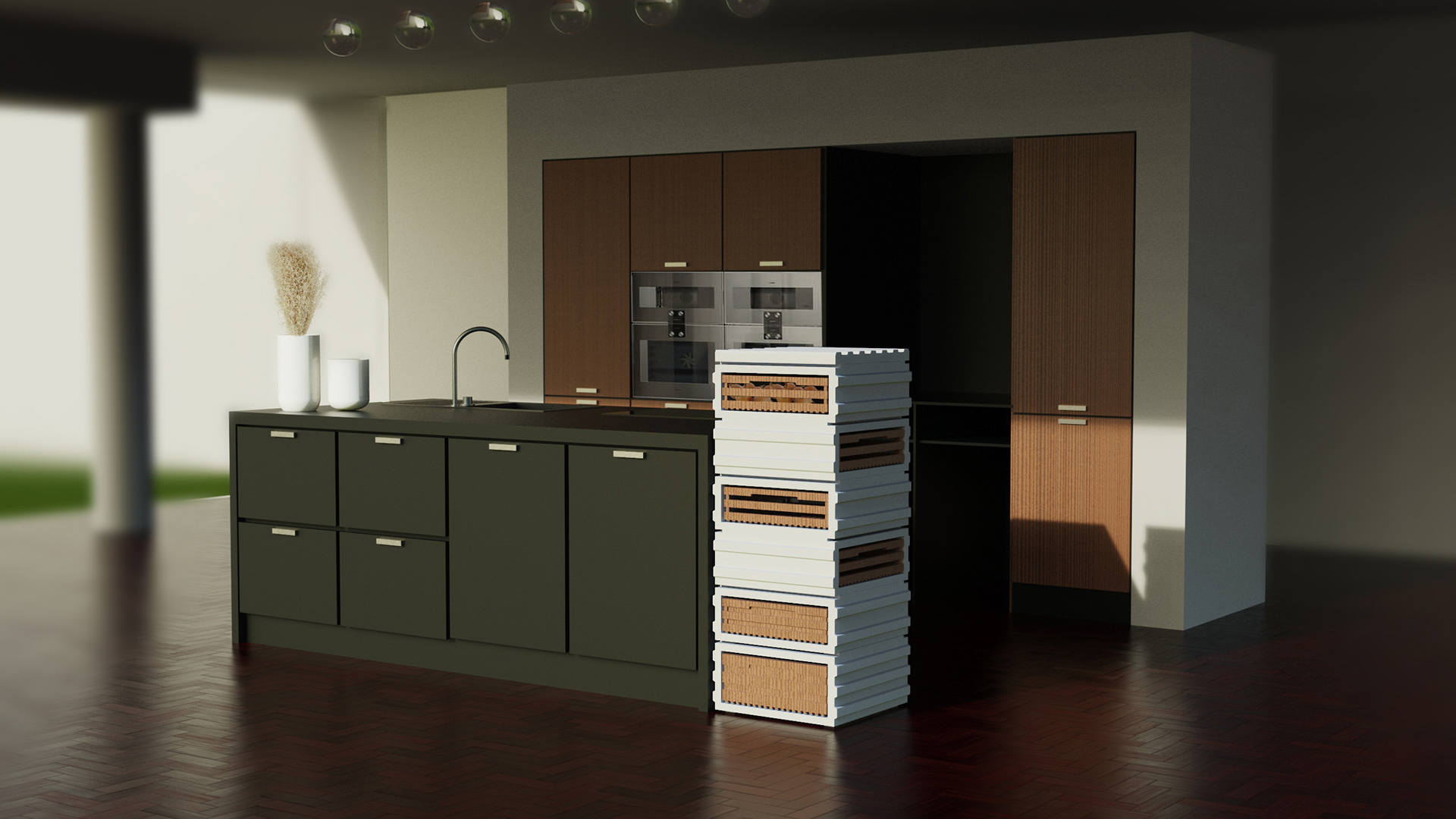Die Module werden Stranggepresst und können sowohl gleichseitig, als auch um 90° verdreht aufeinander gestapelt werden, um so ein von allen Seiten erreichbares Lager zu schaffen. Die Lebensmittel selbst sind in hochwertigen Steigen aus Hartholz gelagert, die stapelbar sind und sich leicht ganz entfernen lassen. So können sie auch direkt zur Ernte oder zum Markt mitgenommen werden, um den Einkauf zu transportieren.